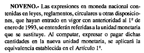 Es decir, la conversión al «nuevo» peso es aplicable también a cantidades previstas en leyes que hayan entrado en vigor antes del primero de enero de 1993. Los montos indicados para el contrato de donación de bienes muebles los preveía el Código Civil para el Distrito Federal antes del primero de enero de 1993, por lo que aplicando el Decreto, tenemos que: (i) sólo puede ser verbal la donación que no exceda de $0.20 (veinte centavos, Moneda Nacional), (ii) debe constar por escrito la que exceda de $0.20 (veinte centavos, Moneda Nacional), pero no de $5.00 (cinco pesos, Moneda Nacional) y (iii) debe constar en escritura pública ante Notario la que exceda de $5.00 (cinco pesos, Moneda Nacional).